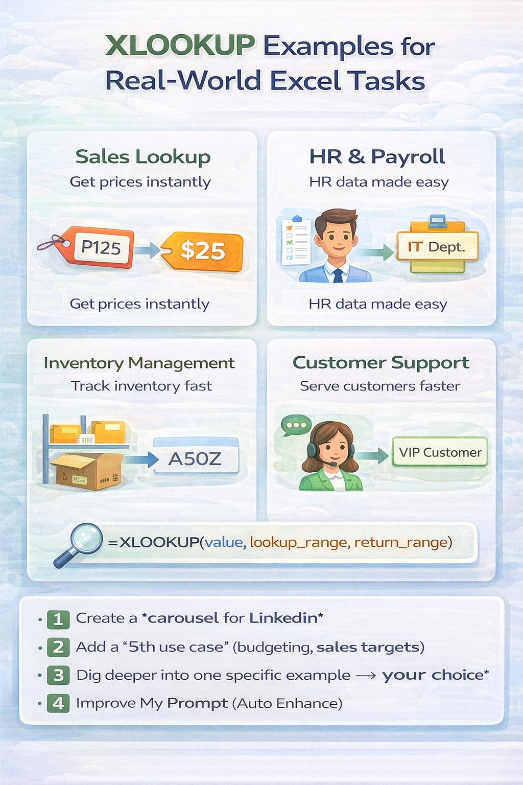 These XLOOKUP examples for real-world Excel tasks show why XLOOKUP has become the go-to lookup function for modern Excel users. Whether you are managing employees, products, prices, or reports, XLOOKUP simplifies your workflow and reduces formula complexity.
